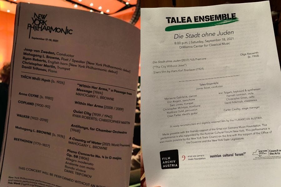 Weeks after I missed this year's tantalizing Time Spans festival entirely, it felt like a genuine achievement to attend two concerts last weekend: the New York Philharmonic's season opener on Friday at Alice Tully Hall, and a significant U.S. premiere by Talea Ensemble at the DiMenna Center for Classical Music. Both were intensely satisfying on manifold levels—not least a feeling of security provided by the COVID-mitigation measures enforced by the organizations and venues. (Near as I could tell, masking was adhered to universally among both audiences.)