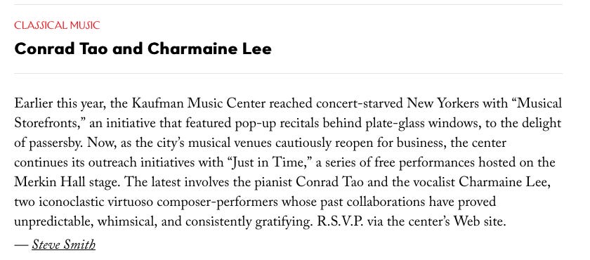 I've just written about this remarkable free event at Merkin Hall for The New Yorker…