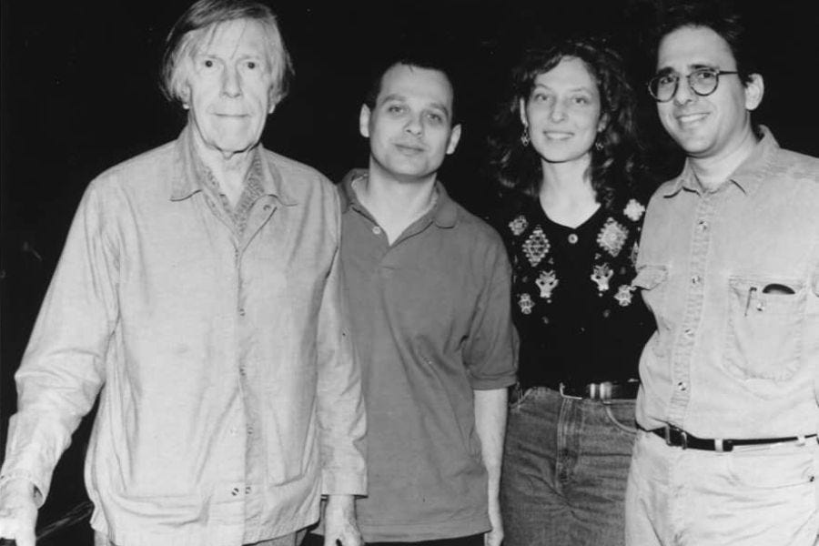 John Cage (left) with David Lang, Julia Wolfe, and Michael Gordon on October 24, 1991. Photograph from CanLand, used with permission