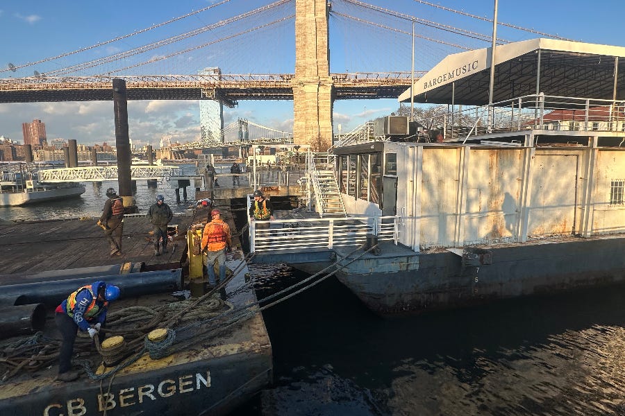 Bargemusic artistic director Mark Peskanov, the performer noted in Wakin’s article, had been on site since 6am to oversee the celebrated vessel’s departure. He addressed the development in a letter to patrons, posted on the Bargemusic website: