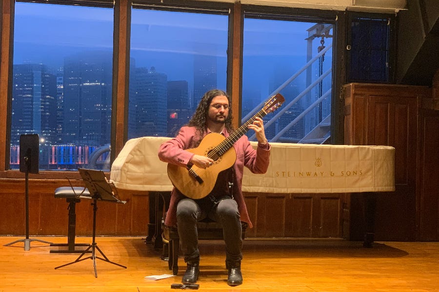 The last time I visited Bargemusic in that storied venue’s original floating location, Boston-based guitarist Aaron Larget-Caplan rocked the boat with an impressively rangy program encompassing Bach, Spanish music, a wide span of contemporary fare, and his own original compositions. The same holds true of this newest visit: at 2pm Larget-Caplan chiefly focuses on Johann Sebastian Bach and Spaniards, as well as a new piece of his own, and at 4pm he’ll present a New York premiere by Ian Wiese alongside works by John Cage, Tōru Takemitsu, David Liptak, Daniel Felsenfeld, and Nikita Koshkin. This stage will stay put this time around, but you can count on Larget-Caplan to provide the sway.