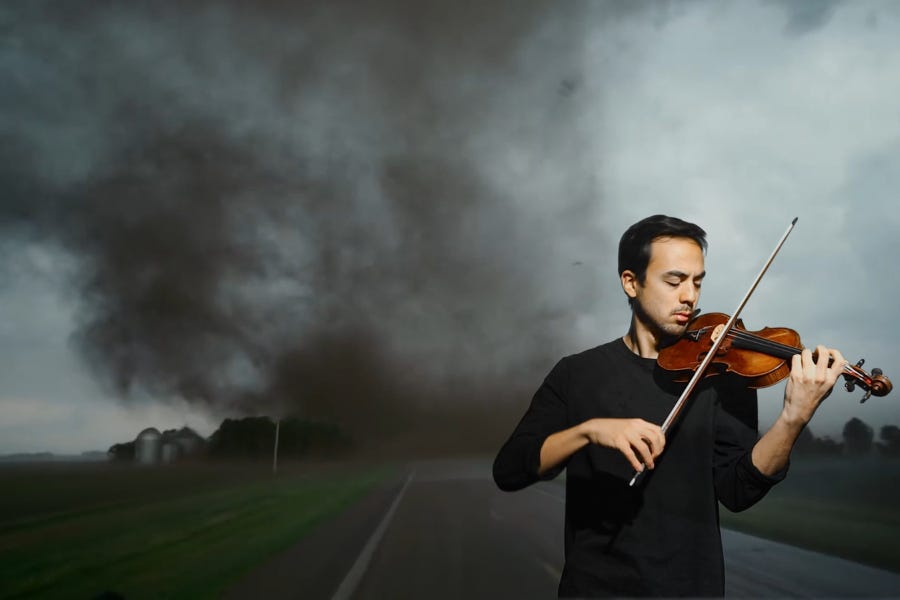 Composers Keir GoGwilt and Celeste Oram present a program of collaborative works that wrest new sounds and statements from historical forms. Included in the mix is the strikingly timely Televisionmann, a 2017 elaboration on Georg Philipp Telemann’s Intrada-Suite for 2 Violins “Gulliver's Travels,” in which GoGwilt plays violin alongside a televised doppelgänger standing outside of then-Senator Kamala Harris’s San Diego office and amid protests against then-President Donald Trump’s so-called “Muslim ban” at the San Diego Airport. (See Tuesday, Nov. 5, for a related event.)