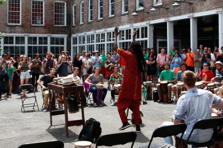 Correction (1:40pm): An artist was misidentified in the photo caption that accompanied the newsletter version of this article. The artist depicted in the second photo is Lamine Touré, seen teaching Senegalese drumming during the 2015 Bang on a Can Summer Institute, not Nani Agbeli teaching Ghanaian drumming in 2018. My apology for the error.