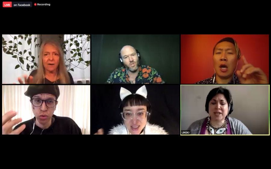 The show encompassed beatnik caterwauling and slapstick mugging, amplified beard stroking and viscous drool. There was a quietly virtuosic recitation by Young, and a beautiful auto-tuned ballad by Pinto, performed with dizzying digital mirroring effects. There also was deep poignancy, again and again: in lines of text spoken or sung by Bell, in simulated backgrounds of sunny Brooklyn skies, and in the incorporation of New York City’s clangorous nightly 7pm salute to doctors, nurses, and essential workers on the front lines of the present pandemic.