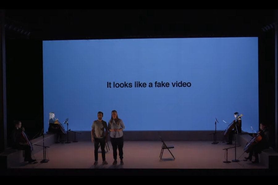 Recounted in a series of fragmentary flashbacks, and punctuated with chirping projections of text messages exchanged by Venables and Huffman, the piece seems tailor-made for our age of extremely online consumption, the 24/7 media cycle, and fake news. The performances by mezzo-soprano Siena Licht Miller, baritone Theo Hoffman, and a quartet of cellists guided invisibly by music director Emily Senturia are sensational, and the imaginatively economical production is pitch perfect. (Trust me: don’t miss this.)