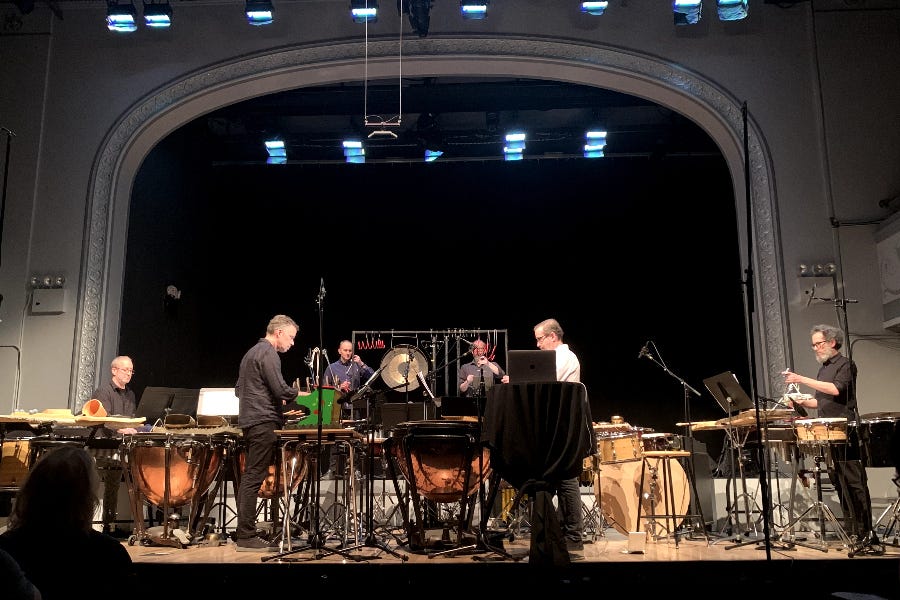 After we chatted, Talujon played the world premiere of Wolff’s Music for Seven Percussion Players, an animated, gregarious frolic with deep grooves amplified by the players’ body language, and some laugh-out-loud keyboard licks as well. Like most of Wolff’s music, the new piece compels and rewards close, attentive cooperation among its players. It was wonderfully effective music, and a piece I’d have loved to get my hands on during my long-ago student percussionist years.