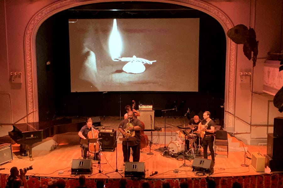 Alongside the leader’s keening alto, guitarist Nick Sala and cellist Christopher Hoffman ventured out and back with agility and sharp contrast – one punky, the other pointed – while bassist Liani Matteo and drummer Jason Nazary provided nuanced propulsion, all underneath enigmatic videos by Laura Sofia Perez. The band was just as compelling in passages of untethered rumination, from which new grooves stealthily coalesced.