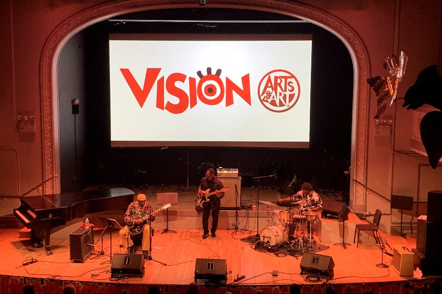The terms shamanic (adj.; pertaining to a religious practice that involves a practitioner interacting with the spirit world through altered states of consciousness, such as trance) and shambolic (adj.; disorganized; messy or confused) aren’t far apart in a dictionary. They were closer still on Thursday night at Roulette, when the mesmerizing guitarist and singer James Blood Ulmer wrapped up the third night of this year’s Vision Festival.