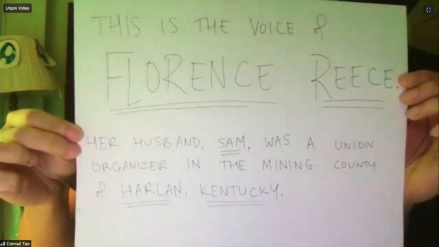 Coming around now to the Bang on the Can performance, a lot of terrific artists got in front of a camera and did personally meaningful things that felt good and were lovely to hear. And the community and camaraderie we always get out of a Bang on a Can event really has managed to survive the transition to this digital realm. But then you got up there and you did your thing with the Florence Reece recording, and the handwritten placards, and then the transition into the hip hop oriented segue – I recognized what it was, but not who it was, so the gesture was not lost, even if I couldn’t name the specifics – and then into a piece famously political, polemical, all the things you would ascribe to Frederic Rzewski’s music. How did you conceive your presentation of Which Side Are You On?
